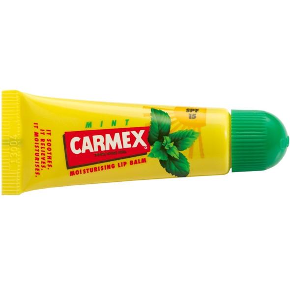- Apply a small amount of Carmex Mint Lip Balm to your lips.