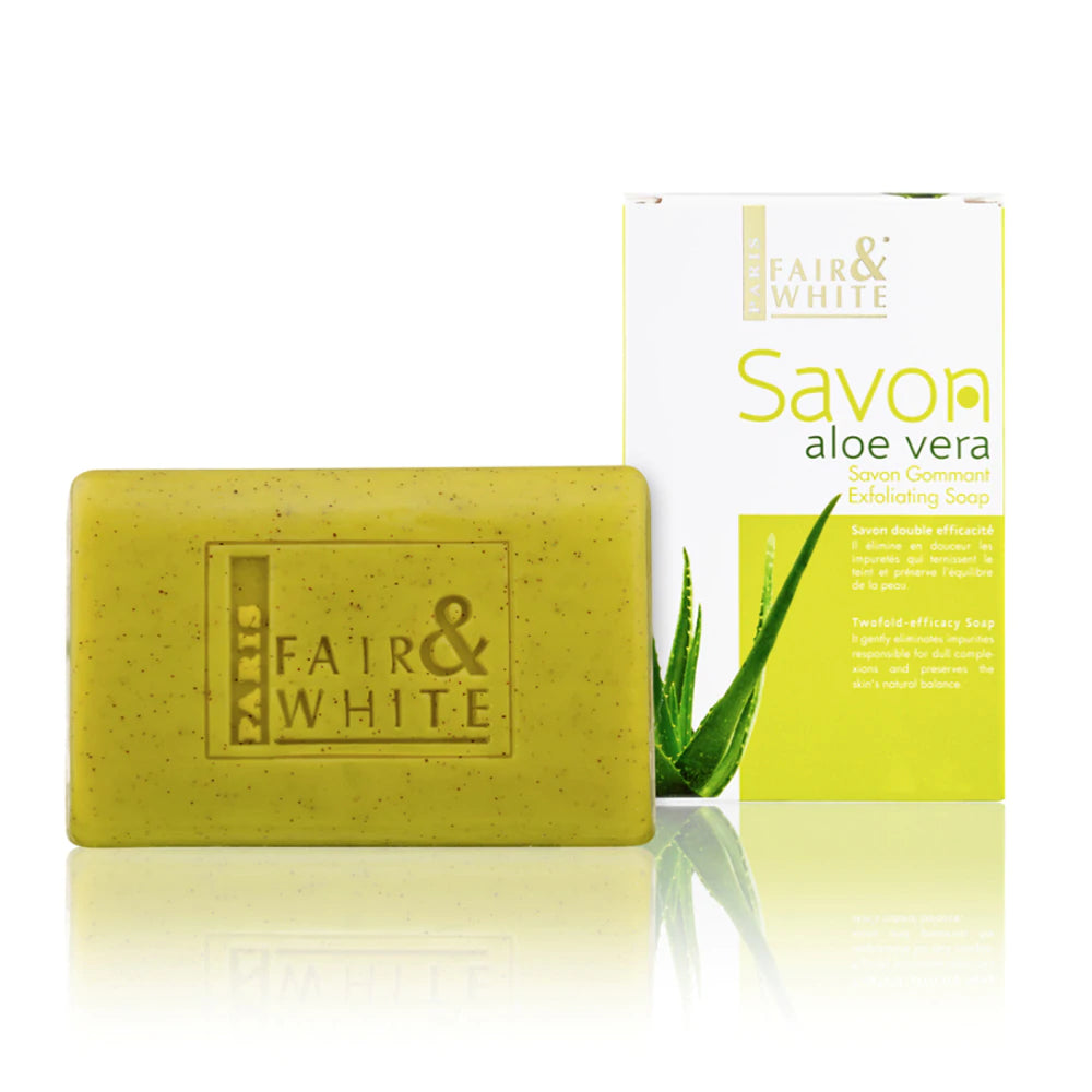 Fair & White Aloe Vera soap exfoliates dull skin without drying or irritating. Cleanses, moisturizes and soothes skin with calming Aloe Vera. Reveals instant glowing skin with exfoliating Apricot Grains