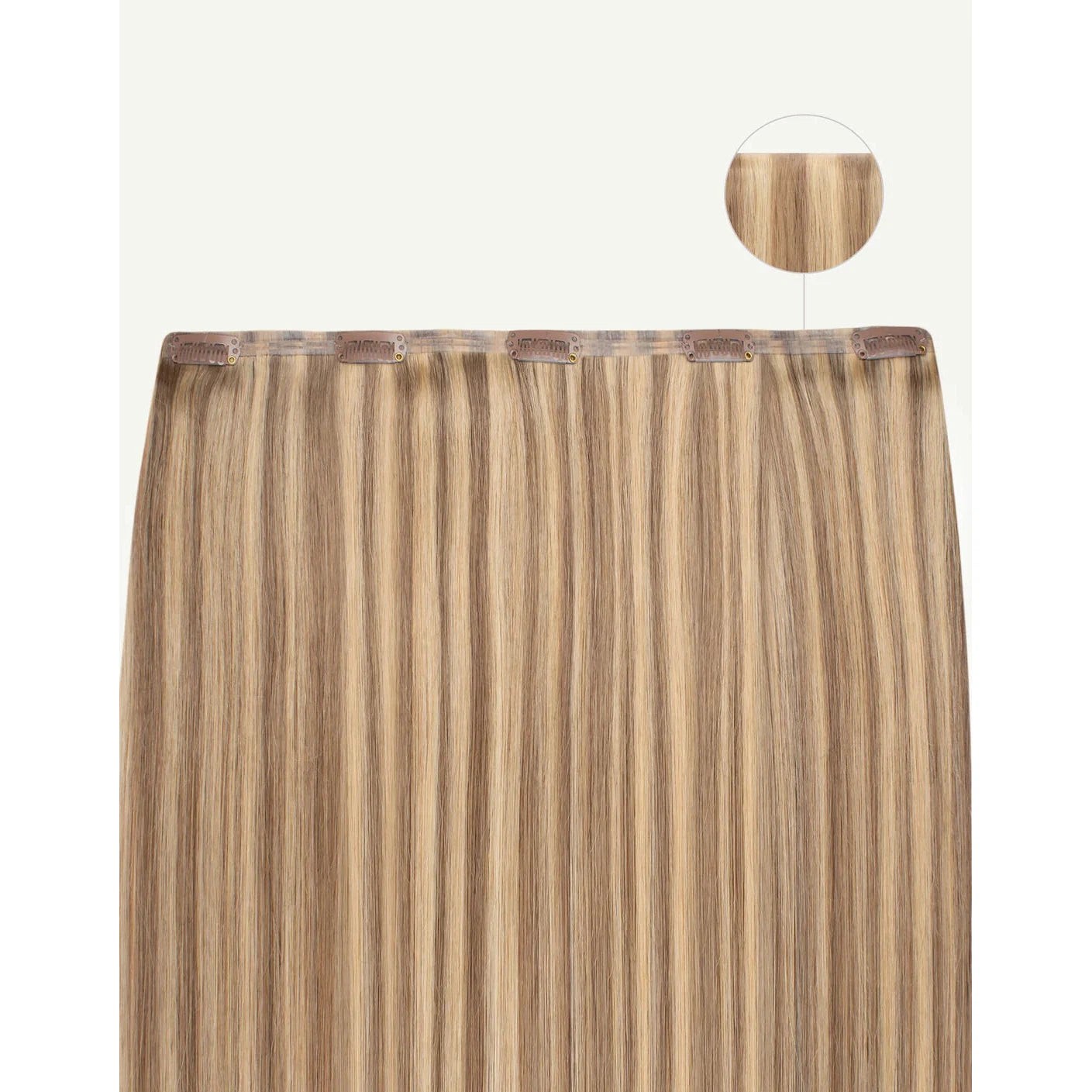 The Hairaisers Luxurious Clip-In Remy Extensions in 14" Colour P5/27 offer a premium, natural way to add length, volume, and colour to your hair. Made from 100% Remy human hair, these extensions provide a smooth, tangle-free texture that blends seamlessly with your natural hair. The 14" length is perfect for adding volume and a subtle boost in length without being too long, making it ideal for creating a fuller, more natural look. The P5/27 colour features a beautiful blend of dark brown (P5) and golden blonde (27) highlights, adding depth and dimension for a sun-kissed, multi-tonal effect.